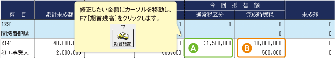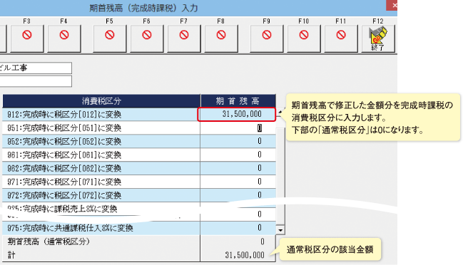 未成工事支出金(仕掛品)や、未成工事受入金(前受金) の期首残高を修正した場合は、 [完成自動振替] で期首残高の税区分を正しく設定してください。