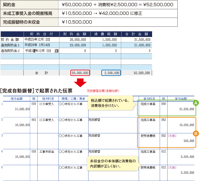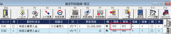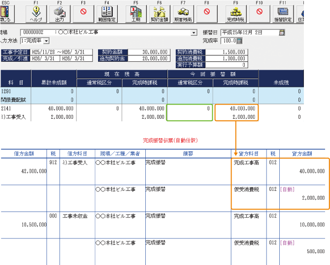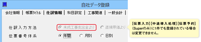 この現象は [初期設定] - [自社データ設定] -「仕訳情報」タブの「仕訳入力方法」で「未成工事支出金(仕掛品)」を選択し、かつ [マスター登録] - [勘定科目登録] や [補助科目登録] で、完成時課税区分(未工事支出金(仕掛品)科目の[952][972]、未成工事受入金(前受金)[912]など)を設定している場合に関係します。